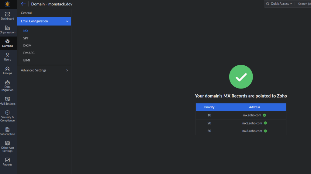 ผมก็ลองหาดูว่าจะทำยังไงได้บ้างน้า ครั้นจะใช้เป็น google workspace มันก็จะดีนะ แต่ๆ งบหมดแล้วอ่ะ ขอเป็นตัวฟรีอะมีไหม ก็ได้ทำการหาอยู่สักพัก …. a few moments later … เราก็ได้มารู้จัก zoho email ลองมาดูแล้ว แบบว่า เห้ยย มันก็เหมือน google ขนาด ย่อมเยาว์เลยนี่นา คิดว่าคงเก่งไม่เท่าหรอก แต่สิ่งที่เขามีก็คือ free plan! เหมาะเลยแบบนี้ จัดการสมัคร account ทำการ link domain, config MX record แล้วก็ Mail security พวก DKIM, DMARC เสร็จสรรพ พร้อมใช้งาน